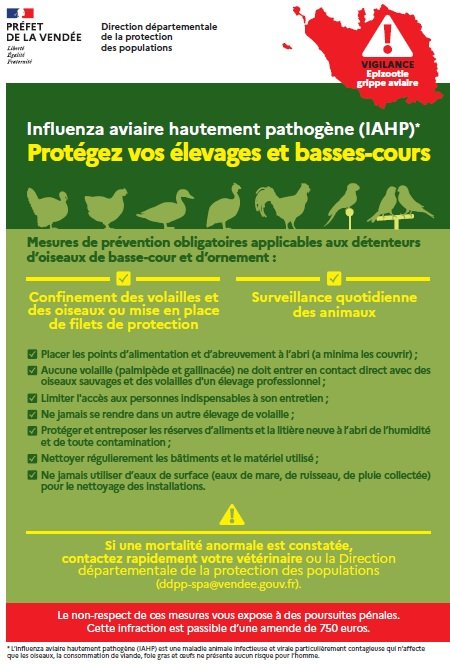 La préfecture de la Vendée vient de déclencher la vigilance rouge dans le cadre de la grippe aviaire IAHP (Influenza Aviaire Hautement Pathogène) et vous communique les mesures de prévention à mettre en place obligatoirement :